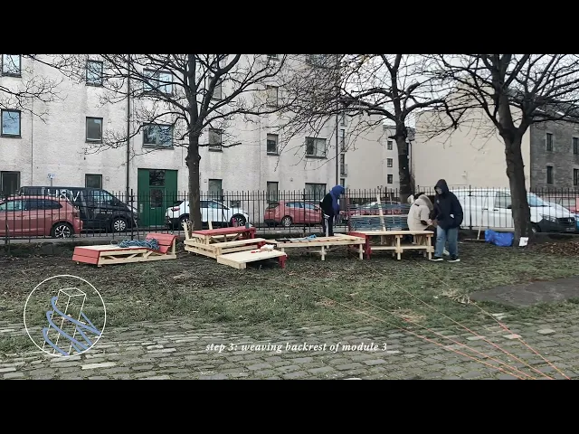 Project 599 is a self-built seating structure located at the South end of Cables Wynd House, on a treelined square overlooking the basketball court. Derived from Scottish and English building standards, the project title references the main design driver for this project, referencing the need for a handrail once platform height exceeds 600mm.