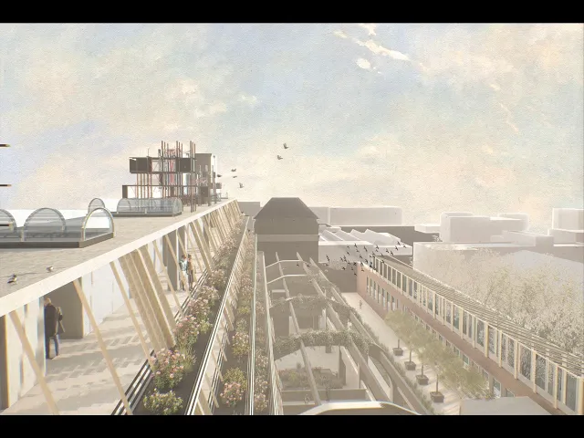 Our design draws inspiration from 19th-century Schrebergärten (allotment gardens) and railway wasteland transformation, combining these historical elements with modern residential blocks. The project retains the steel frames or useful concrete structure (indicated by red in enclave map) of existing industrial buildings, introducing sustainable pavilions and architecture that promote a harmonious balance between human habitation and rewilding. We incorporate boundless community farming, plant nurseries, and vertical gardening to facilitate this transformation.