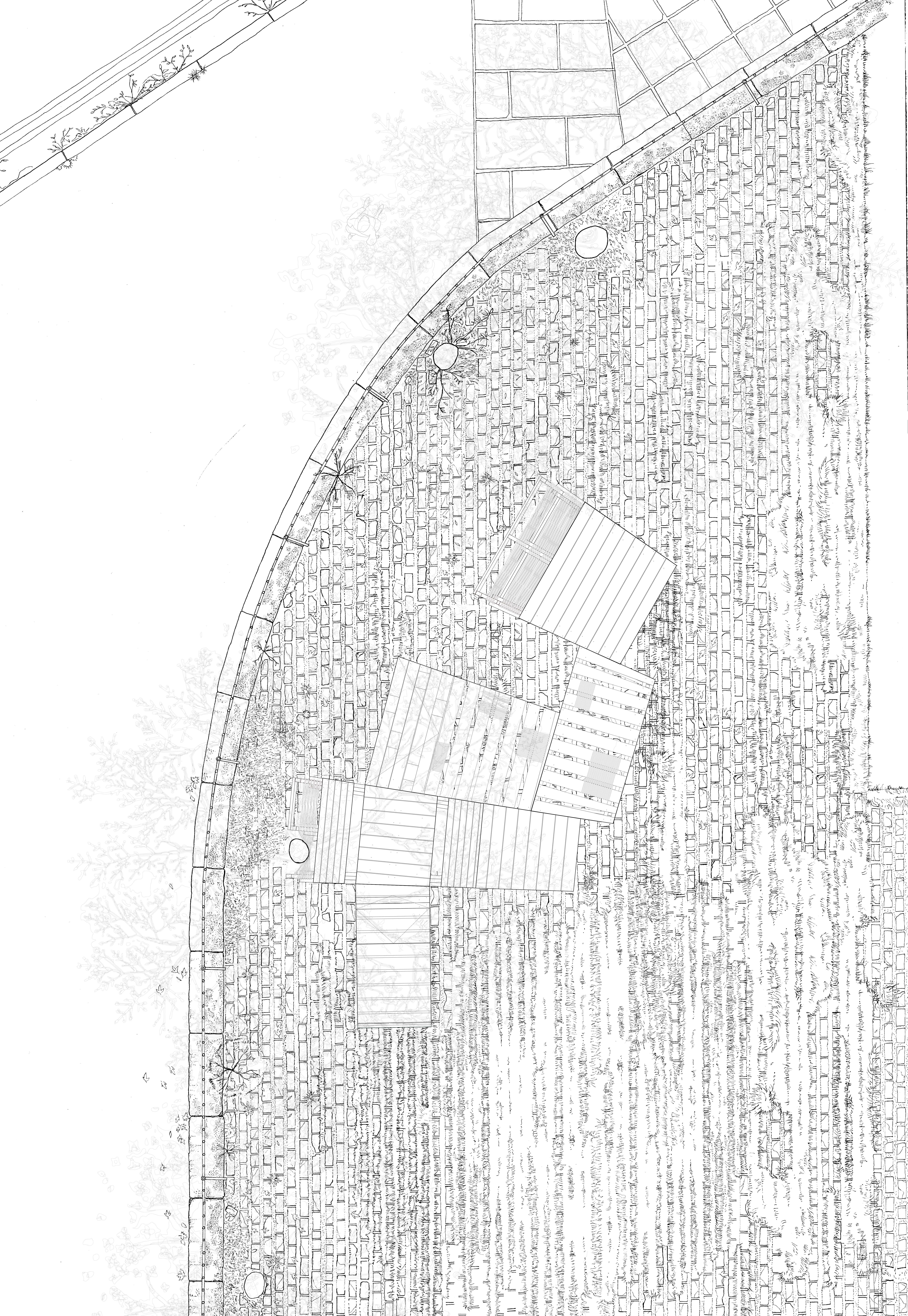 Project 599 is a self-built seating structure located at the South end of Cables Wynd House, on a treelined square overlooking the basketball court. Derived from Scottish and English building standards, the project title references the main design driver for this project, referencing the need for a handrail once platform height exceeds 600mm.